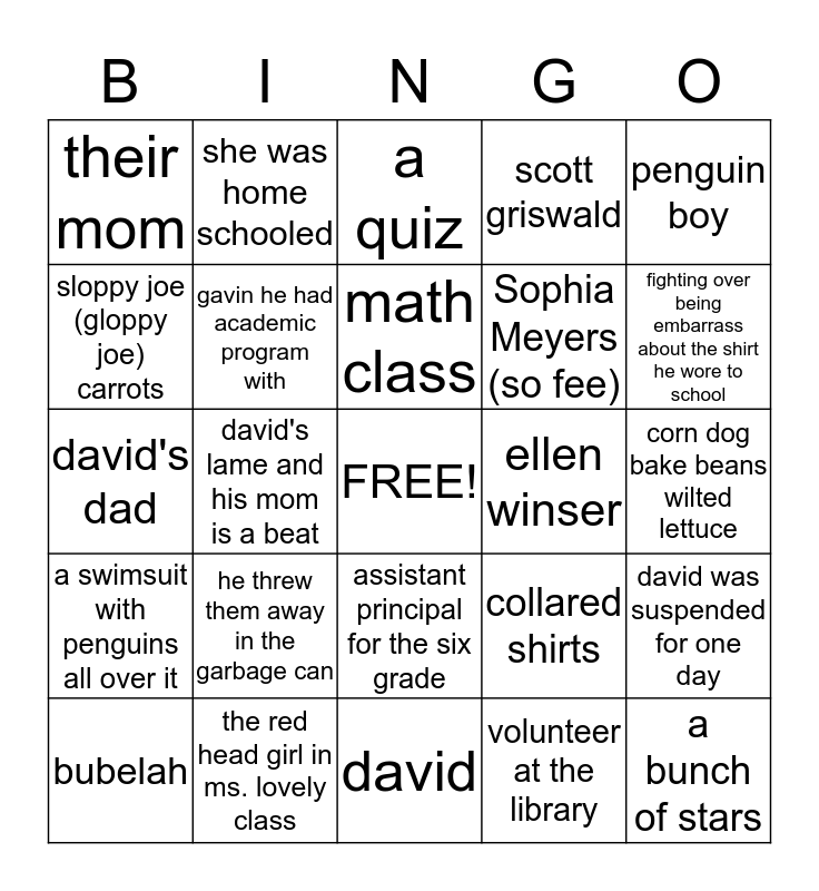 This bingo card has a free space and 24 words: he threw them away in the garbage can, the red head girl in ms. lovely class, math class, bubelah, penguin boy, their mom, sloppy joe (gloppy joe) carrots, she was home schooled, ellen winser, assistant principal for the six grade, Sophia Meyers (so fee), david's dad, collared shirts, david was suspended for one day, gavin he had academic program with, volunteer at the library, corn dog bake beans wilted lettuce, a quiz, fighting over being embarrass about the shirt he wore to school, david's lame and his mom is a beat, a bunch of stars, a swimsuit with penguins all over it, scott griswald and david.