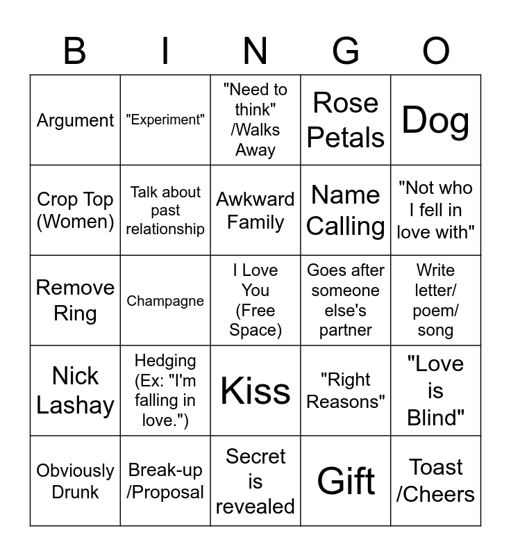 This bingo card has a free space and 24 words: Hedging (Ex: "I'm falling in love."), Break-up /Proposal, Awkward Family, Obviously Drunk, Dog, Argument, Crop Top (Women), "Experiment", Goes after someone else's partner, Kiss, Name Calling, Remove Ring, "Right Reasons", "Love is Blind", Talk about past relationship, Gift, Write letter/ poem/ song, "Need to think" /Walks Away, "Not who I fell in love with", Champagne, Toast /Cheers, Nick Lashay, Rose Petals and Secret is revealed.