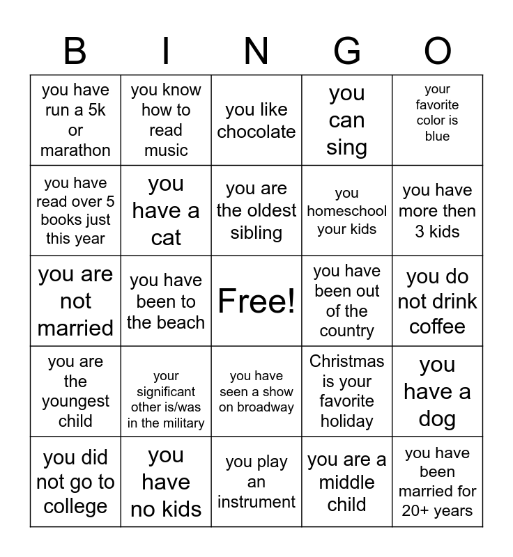 This bingo card has a free space and 24 words: your significant other is/was in the military, you have no kids, you are the oldest sibling, you did not go to college, your favorite color is blue, you have run a 5k or marathon, you have read over 5 books just this year, you know how to read music, you have been out of the country, you have seen a show on broadway, you homeschool your kids, you are not married, Christmas is your favorite holiday, you have a dog, you have a cat, you are a middle child, you do not drink coffee, you like chocolate, you have more then 3 kids, you have been to the beach, you have been married for 20+ years, you are the youngest child, you can sing and you play an instrument.