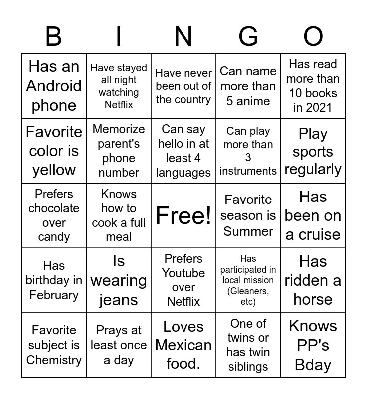 This bingo card has a free space and 24 words: Is wearing jeans, Prays at least once a day, Can say hello in at least 4 languages, Favorite subject is Chemistry, Has read more than 10 books in 2021, Has an Android phone, Favorite color is yellow, Have stayed all night watching Netflix, Favorite season is Summer, Prefers Youtube over Netflix, Can play more than 3 instruments, Prefers chocolate over candy, Has participated in local mission (Gleaners, etc), Has ridden a horse, Memorize parent's phone number, One of twins or has twin siblings, Has been on a cruise, Have never been out of the country, Play sports regularly, Knows how to cook a full meal, Knows PP's Bday, Has birthday in February, Can name more than 5 anime and Loves Mexican food..