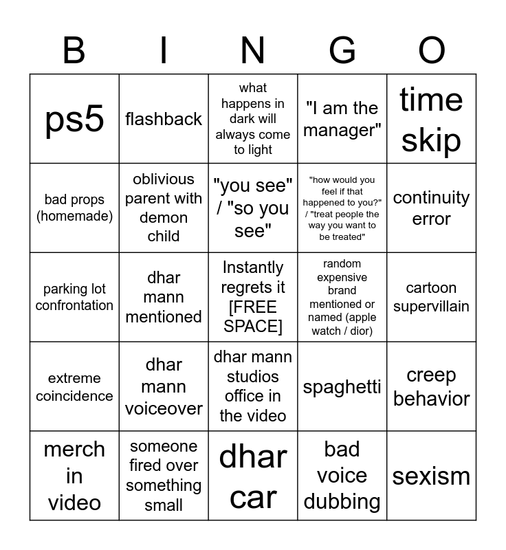 This bingo card has a free space and 25 words: dhar mann voiceover, dhar car, "you see" / "so you see", merch in video, time skip, ps5, bad props (homemade), flashback, random expensive brand mentioned or named (apple watch / dior), dhar mann studios office in the video, "how would you feel if that happened to you?" / "treat people the way you want to be treated", parking lot confrontation, spaghetti, creep behavior, oblivious parent with demon child, kids with ipad, cartoon supervillain, what happens in dark will always come to light, continuity error, dhar mann mentioned, sexism, someone fired over something small, extreme coincidence, "I am the manager" and bad voice dubbing.