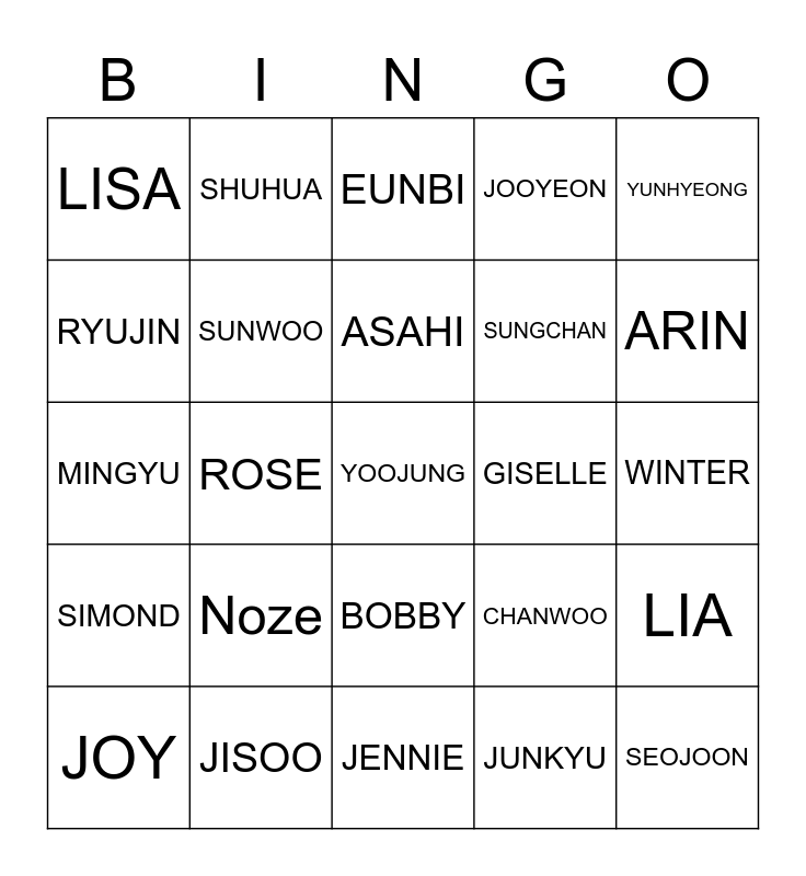 This bingo card has a free space and 24 words: Noze, JISOO, ASAHI, JOY, YUNHYEONG, LISA, RYUJIN, SHUHUA, GISELLE, BOBBY, SUNGCHAN, MINGYU, CHANWOO, LIA, SUNWOO, JUNKYU, WINTER, EUNBI, ARIN, ROSE, SEOJOON, SIMOND, JOOYEON and JENNIE.