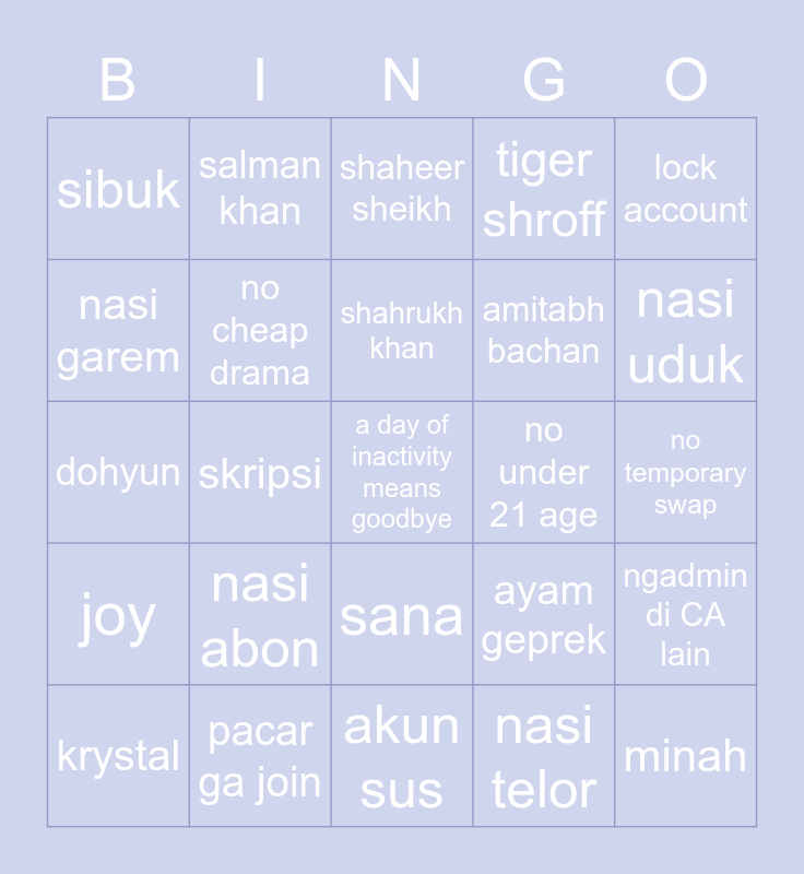 This bingo card has 25 words: nasi abon, akun sus, shahrukh khan, krystal, lock account, sibuk, nasi garem, salman khan, no under 21 age, sana, amitabh bachan, dohyun, ayam geprek, ngadmin di CA lain, no cheap drama, minah, no temporary swap, shaheer sheikh, nasi uduk, skripsi, a day of inactivity means goodbye, pacar ga join, joy, tiger shroff and nasi telor.