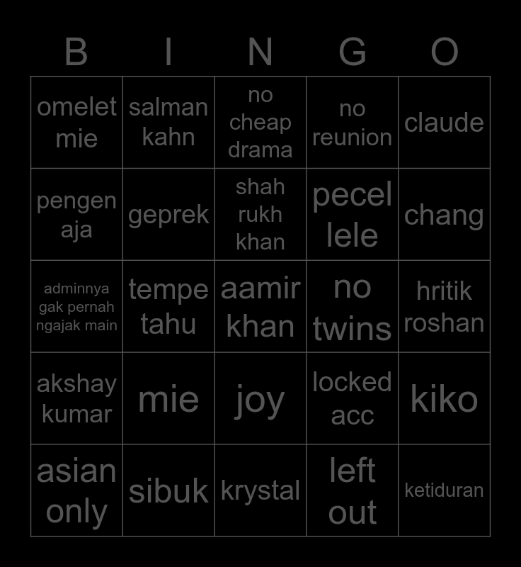 This bingo card has a free space and 24 words: mie, sibuk, shah rukh khan, asian only, claude, omelet mie, pengen aja, salman kahn, no twins, joy, pecel lele, adminnya gak pernah ngajak main, locked acc, kiko, geprek, left out, hritik roshan, no cheap drama, chang, tempe tahu, ketiduran, akshay kumar, no reunion and krystal.