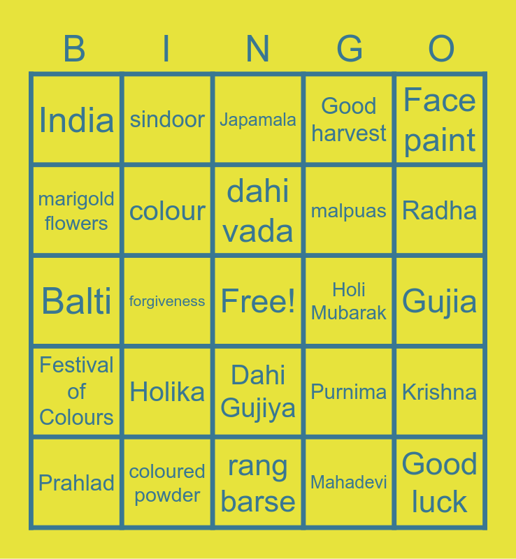This bingo card has a free space and 40 words: Ashes, Balti, Bhaang, colour, coloured powder, Dahi Gujiya, dahi vada, Dharma, Face paint, Festival of Colours, forgiveness, Good harvest, Good luck, Gujia, Holi Mubarak, Holika, Holika Dahan, India, Jalebi, Japamala, Krishna, Mahadevi, malpuas, marigold flowers, mathri, mehndi leaves, mithai, Narasimha, Phalguna, Phalguna, Pichkari, Prahlad, purnan poli, Purnima, Radha, rang barse, rangoli, Rangwali Holi, sindoor and Vishnu.