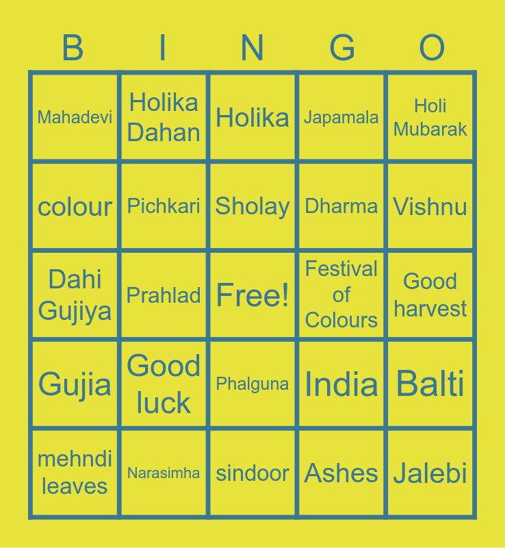 This bingo card has a free space and 40 words: dahi vada, Dahi Gujiya, coloured powder, Pichkari, Narasimha, Phalguna, Sholay, Face paint, Holi Mubarak, Gujia, Prahlad, Japamala, Jalebi, Good harvest, Festival of Colours, Good luck, malpuas, Mahadevi, Krishna, Holika, Balti, Ashes, Dharma, colour, Bhaang, rang barse, Radha, Purnima, purnan poli, Rangwali Holi, rangoli, mehndi leaves, mathri, India, Vishnu, sindoor, mithai, marigold flowers, Holika Dahan and forgiveness.