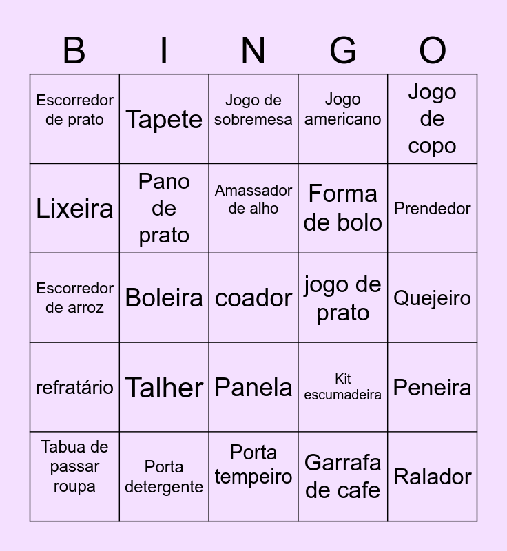 This bingo card has 27 words: Kit escumadeira, Ralador, Forma de bolo, Porta tempeiro, Lixeira, Jogo de sobremesa, Tapete, refratário, jogo de prato, Peneira, Escorredor de arroz, Jogo americano, Tabua de passar roupa, Porta detergente, Prendedor, Varal de chão, Pano de prato, Amassador de alho, Talher, Escorredor de prato, Quejeiro, Garrafa de cafe, Boleira, coador, Panela, Jogo de copo and Faca.