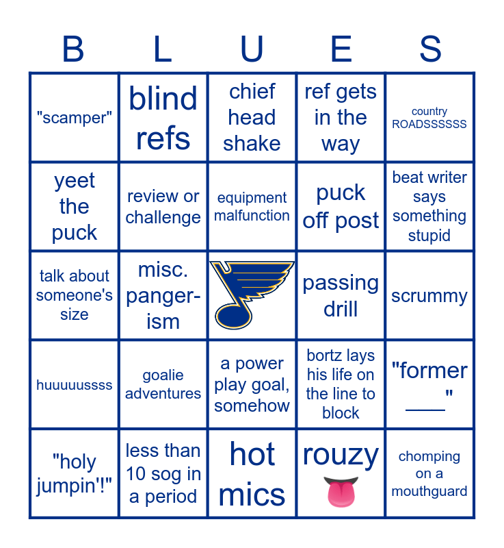This bingo card has a free space and 29 words: "holy jumpin'!", too much man, misc. panger-ism, empty netter, "scamper", chief head shake, review or challenge, goalie adventures, passing drill, less than 10 sog in a period, scrummy, chomping on a mouthguard, hot mics, rouzy👅, beat writer says something stupid, someone has an ugly tie on, a power play goal, somehow, huuuuussss, country ROADSSSSSS, talk about someone's size, bortz lays his life on the line to block, broken stick, puck off post, yeet the puck, ref gets in the way, blind refs, "former ___", equipment malfunction and player "gets on his horse".