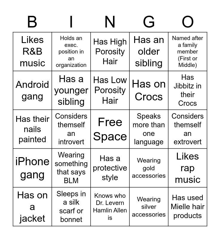 This bingo card has a free space and 24 words: Wearing something that says BLM, Sleeps in a silk scarf or bonnet, Has Low Porosity Hair, Has on a jacket, Named after a family member (First or Middle), Likes R&B music, Android gang, Holds an exec. position in an organization, Speaks more than one language, Has a protective style, Has on Crocs, Has their nails painted, Wearing gold accessories, Likes rap music, Has a younger sibling, Wearing silver accessories, Considers themself an extrovert, Has High Porosity Hair, Has Jibbitz in their Crocs, Considers themself an introvert, Has used Mielle hair products, iPhone gang, Has an older sibling and Knows who Dr. Levern Hamlin Allen is.