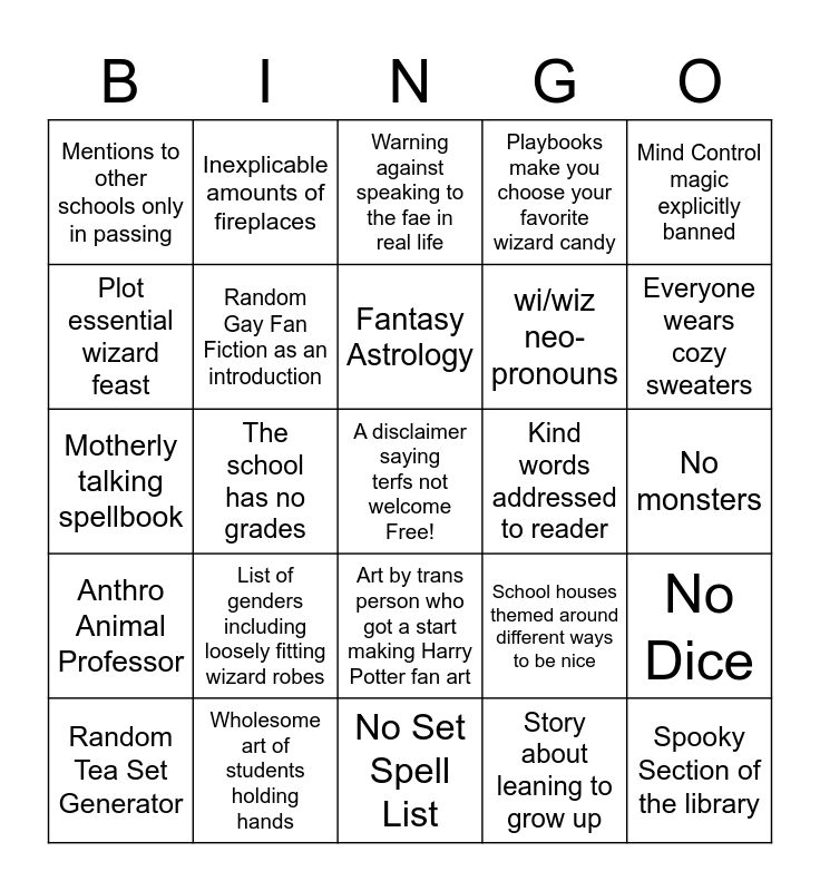 This bingo card has a free space and 24 words: List of genders including loosely fitting wizard robes, Wholesome art of students holding hands, Fantasy Astrology, Random Tea Set Generator, Mind Control magic explicitly banned, Mentions to other schools only in passing, Plot essential wizard feast, Inexplicable amounts of fireplaces, Kind words addressed to reader, Art by trans person who got a start making Harry Potter fan art, wi/wiz neo-pronouns, Motherly talking spellbook, School houses themed around different ways to be nice, No Dice, Random Gay Fan Fiction as an introduction, Story about leaning to grow up, No monsters, Warning against speaking to the fae in real life, Everyone wears cozy sweaters, The school has no grades, Spooky Section of the library, Anthro Animal Professor, Playbooks make you choose your favorite wizard candy and No Set Spell List.