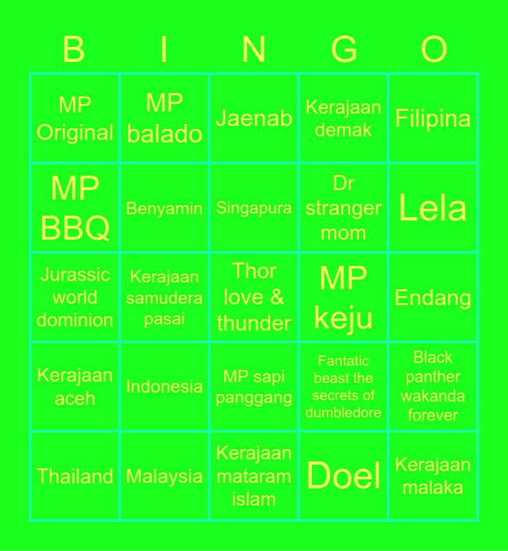 This bingo card has a free space and 24 words: Indonesia, Malaysia, Singapura, Thailand, Filipina, MP Original, MP BBQ, MP balado, MP keju, MP sapi panggang, Dr stranger mom, Jurassic world dominion, Fantatic beast the secrets of dumbledore, Black panther wakanda forever, Benyamin, Doel, Endang, Jaenab, Lela, Kerajaan samudera pasai, Kerajaan malaka, Kerajaan aceh, Kerajaan demak and Kerajaan mataram islam.