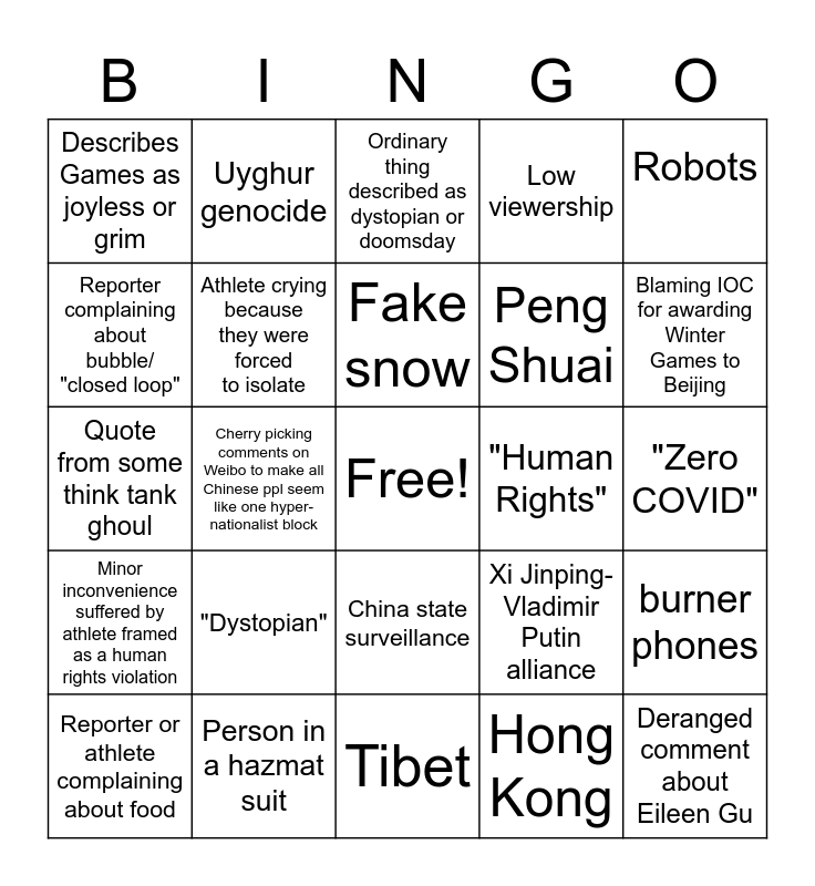 This bingo card has a free space and 24 words: "Dystopian", Person in a hazmat suit, Fake snow, Reporter or athlete complaining about food, Robots, Describes Games as joyless or grim, Reporter complaining about bubble/ "closed loop", Uyghur genocide, "Human Rights", China state surveillance, Peng Shuai, Quote from some think tank ghoul, Xi Jinping- Vladimir Putin alliance, burner phones, Athlete crying because they were forced to isolate, Hong Kong, "Zero COVID", Ordinary thing described as dystopian or doomsday, Blaming IOC for awarding Winter Games to Beijing, Cherry picking comments on Weibo to make all Chinese ppl seem like one hyper-nationalist block, Deranged comment about Eileen Gu, Minor inconvenience suffered by athlete framed as a human rights violation, Low viewership and Tibet.