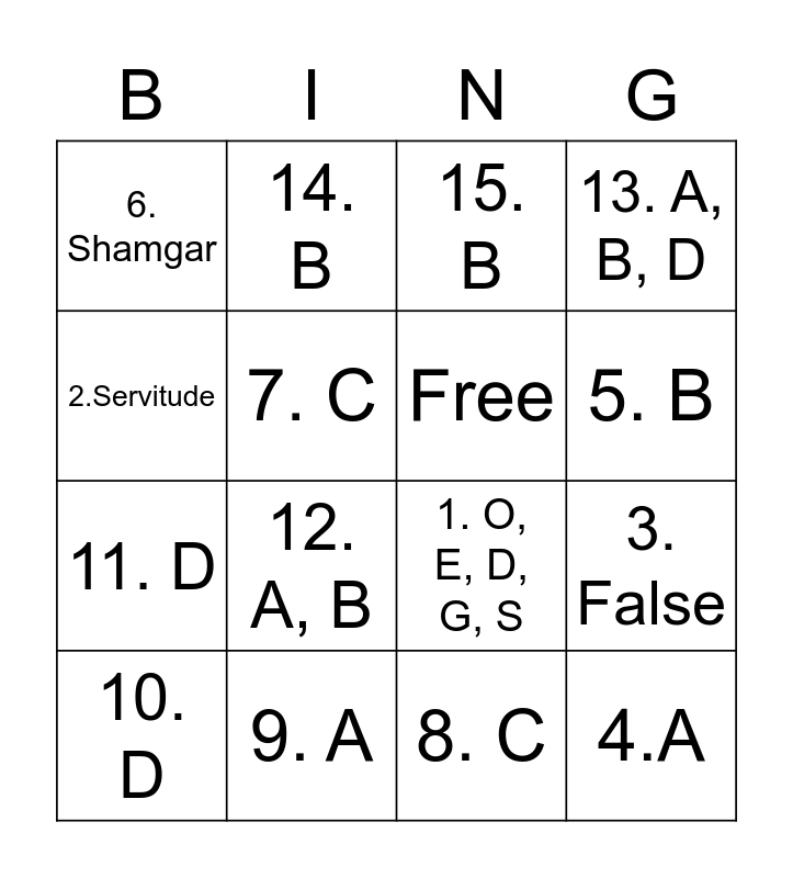 This bingo card has 16 words: 9. A, 3. False, 15. B, 6. Shamgar, 11. D, 14. B, 1. O, E, D, G, S, 8. C, 2.Servitude, 7. C, 10. D, 13. A, B, D, 12. A, B, 5. B, Free and 4.A.