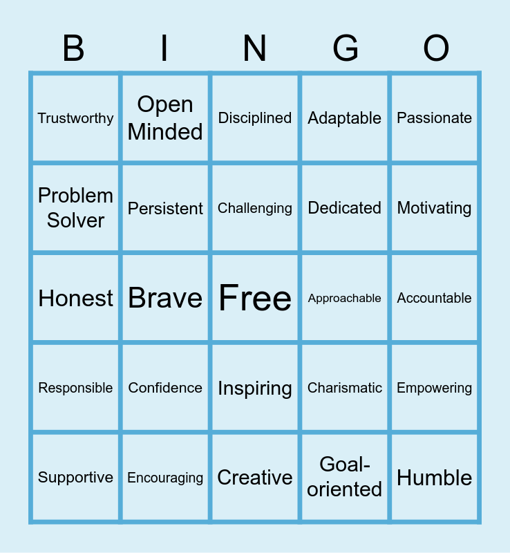 This bingo card has a free space and 24 words: Confidence, Encouraging, Challenging, Supportive, Passionate, Trustworthy, Problem Solver, Open Minded, Approachable, Inspiring, Dedicated, Honest, Charismatic, Empowering, Persistent, Goal-oriented, Accountable, Disciplined, Motivating, Brave, Humble, Responsible, Adaptable and Creative.