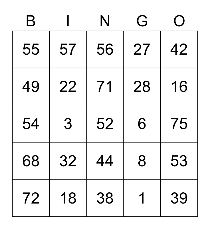This bingo card has 25 words: 32, 38, 71, 72, 42, 55, 49, 57, 6, 44, 28, 54, 8, 53, 22, 39, 75, 56, 16, 3, 52, 18, 68, 27 and 1.