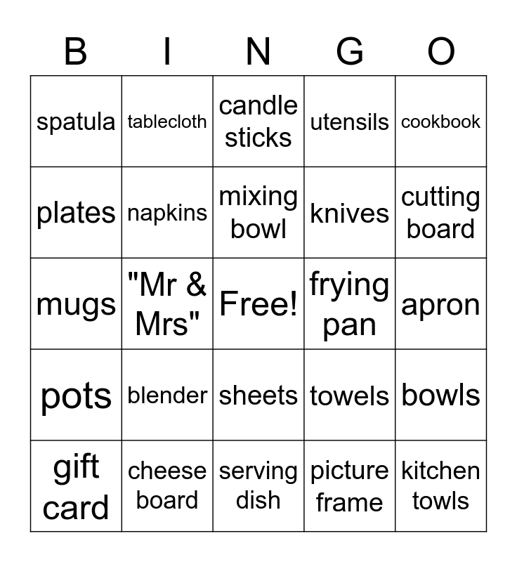 This bingo card has a free space and 27 words: towels, crystal, knives, serving dish, plates, candle sticks, tablecloth, pots, frying pan, bowls, mugs, utensils, gift card, cheese board, cutting board, tea pot, napkins, mixing bowl, blender, spatula, apron, picture frame, "Mr & Mrs", kitchen towls, sheets, cookbook and something handmade.