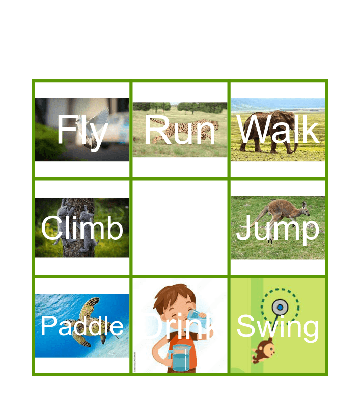 This bingo card has 8 images, a free space and 8 words: Jump, Walk, Run, Paddle, Fly, Swing, Climb and Drink.