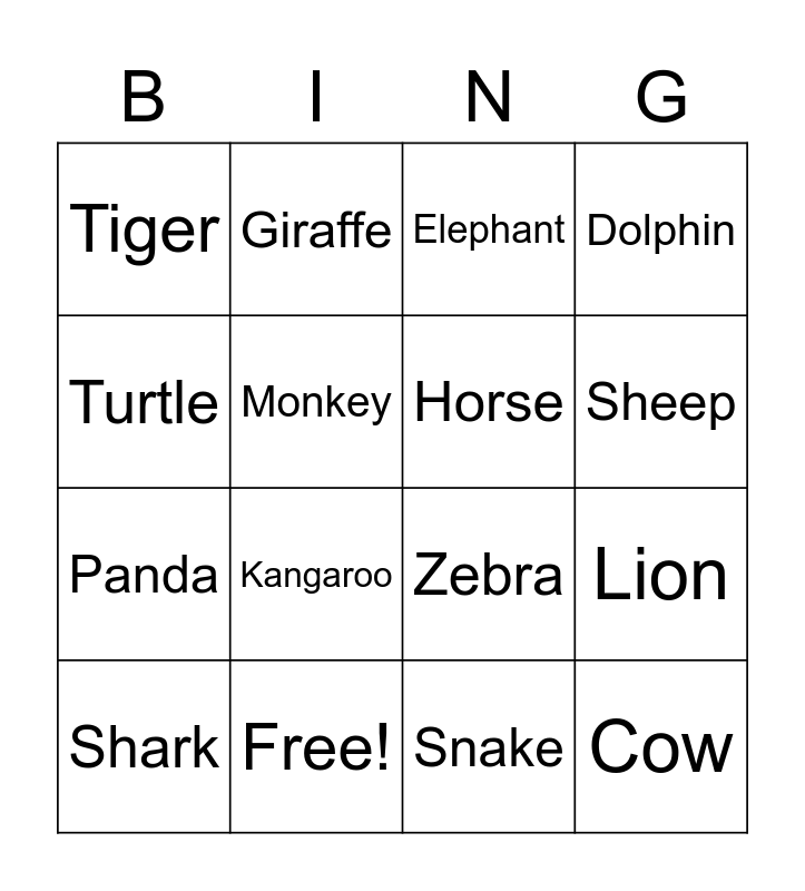 This bingo card has 16 words: Free!, Lion, Elephant, Tiger, Panda, Giraffe, Zebra, Snake, Turtle, Monkey, Shark, Dolphin, Kangaroo, Sheep, Horse and Cow.