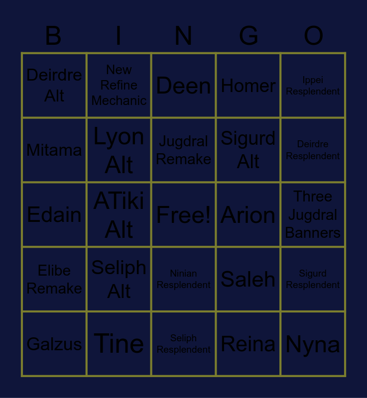 This bingo card has a free space and 24 words: Seliph Alt, Tine, Jugdral Remake, Galzus, Ippei Resplendent, Deirdre Alt, Mitama, New Refine Mechanic, Arion, Ninian Resplendent, Sigurd Alt, Edain, Saleh, Sigurd Resplendent, Lyon Alt, Reina, Three Jugdral Banners, Deen, Deirdre Resplendent, ATiki Alt, Nyna, Elibe Remake, Homer and Seliph Resplendent.