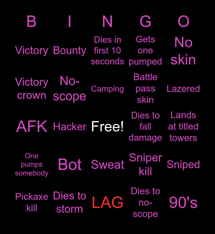 This bingo card has a free space and 24 words: Bot, Dies to storm, Camping, Pickaxe kill, No skin, Victory, Victory crown, Bounty, Dies to fall damage, Sweat, Battle pass skin, AFK, Sniper kill, Sniped, No-scope, Dies to no-scope, Lands at titled towers, Dies in first 10 seconds, Lazered, Hacker, 90's, One pumps somebody, Gets one pumped and LAG.