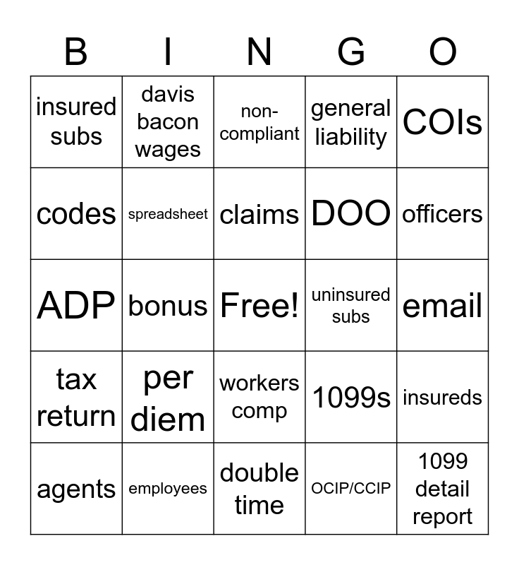 This bingo card has a free space and 35 words: exposure, records, Quickbooks, spreadsheet, workers comp, general liability, codes, rates, claims, Paychex, ADP, COIs, 941s, payroll report, insured subs, uninsured subs, OCIP/CCIP, bonus, tax return, 1099 detail report, 1099s, agents, insureds, employees, non-compliant, officers, overtime, duties, DOO, email, title, double time, per diem, davis bacon wages and crane operator.