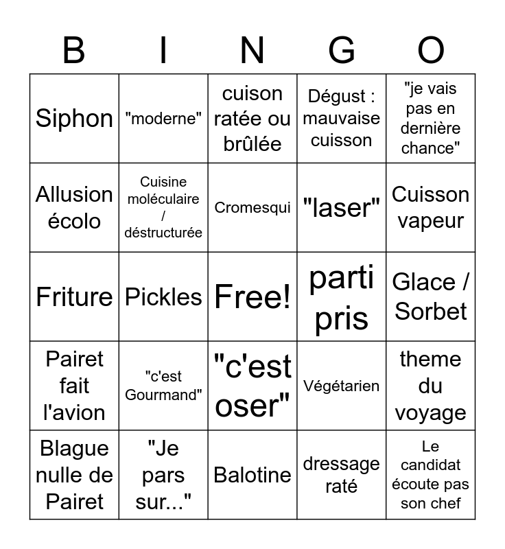 This bingo card has a free space and 24 words: "c'est Gourmand", "Je pars sur...", Cromesqui, Blague nulle de Pairet, "je vais pas en dernière chance", Siphon, Allusion écolo, "moderne", parti pris, "c'est oser", "laser", Friture, Végétarien, theme du voyage, Cuisine moléculaire / déstructurée, dressage raté, Glace / Sorbet, cuison ratée ou brûlée, Cuisson vapeur, Pickles, Le candidat écoute pas son chef, Pairet fait l'avion, Dégust : mauvaise cuisson and Balotine.