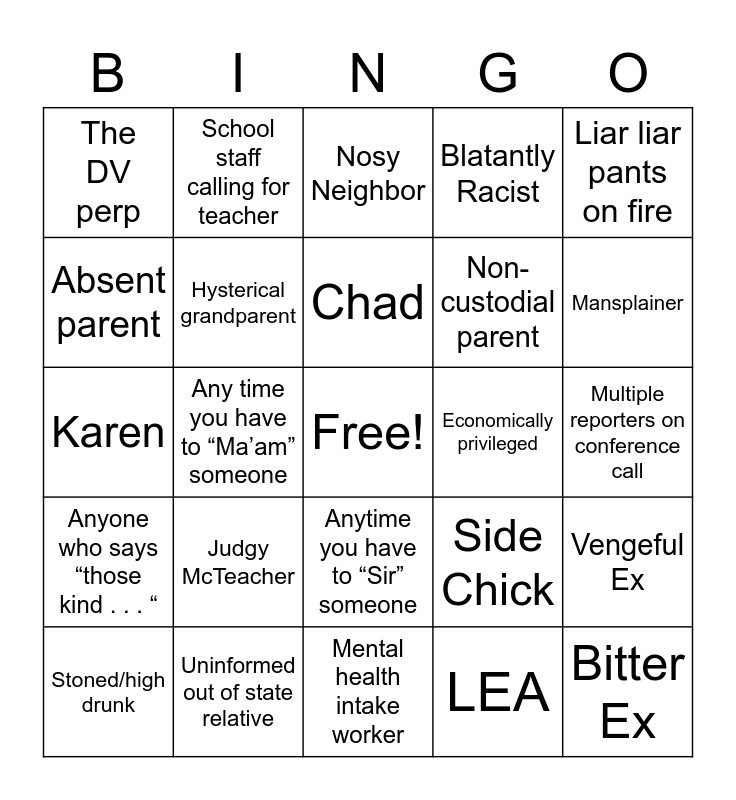 This bingo card has a free space and 24 words: Judgy McTeacher, Uninformed out of state relative, Chad, Stoned/high drunk, Liar liar pants on fire, The DV perp, Absent parent, School staff calling for teacher, Economically privileged, Anytime you have to “Sir” someone, Non-custodial parent, Karen, Side Chick, Vengeful Ex, Hysterical grandparent, LEA, Multiple reporters on conference call, Nosy Neighbor, Mansplainer, Any time you have to “Ma’am” someone, Bitter Ex, Anyone who says “those kind . . . “, Blatantly Racist and Mental health intake worker.