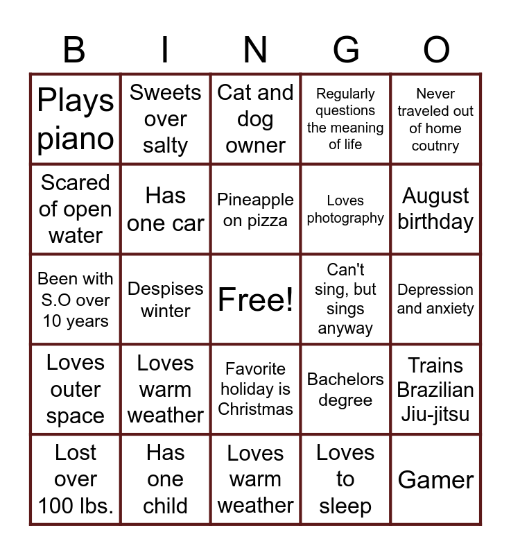 This bingo card has a free space and 24 words: Lost over 100 lbs., Loves warm weather, Pineapple on pizza, Loves to sleep, Never traveled out of home coutnry, Plays piano, Sweets over salty, Cat and dog owner, Can't sing, but sings anyway, Depression and anxiety, Been with S.O over 10 years, Has one car, Bachelors degree, Trains Brazilian Jiu-jitsu, Scared of open water, Has one child, Loves warm weather, Regularly questions the meaning of life, August birthday, Loves outer space, Despises winter, Favorite holiday is Christmas, Loves photography and Gamer.