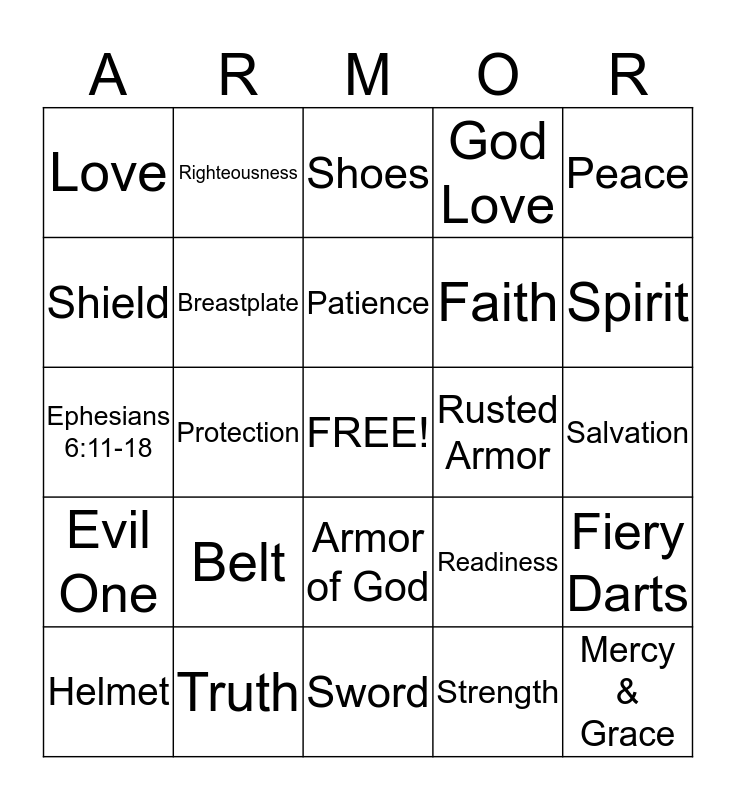 This bingo card has a free space and 24 words: Belt, Truth, Patience, Helmet, Peace, Love, Shield, Righteousness, Rusted Armor, Armor of God, Faith, Ephesians 6:11-18, Readiness, Fiery Darts, Breastplate, Strength, Salvation, Shoes, Spirit, Protection, Mercy & Grace, Evil One, God Love and Sword.