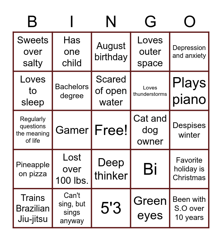 This bingo card has a free space and 24 words: Trains Brazilian Jiu-jitsu, Lost over 100 lbs., Scared of open water, Green eyes, Depression and anxiety, Sweets over salty, Has one child, August birthday, Cat and dog owner, Despises winter, Regularly questions the meaning of life, Bachelors degree, Bi, Favorite holiday is Christmas, Loves to sleep, Can't sing, but sings anyway, 5'3, Loves outer space, Plays piano, Pineapple on pizza, Gamer, Deep thinker, Loves thunderstorms and Been with S.O over 10 years.