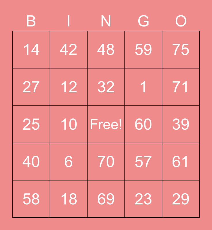 This bingo card has a free space and 24 words: 6, 18, 32, 58, 75, 14, 27, 42, 60, 70, 1, 25, 57, 61, 12, 23, 39, 48, 71, 10, 29, 40, 59 and 69.