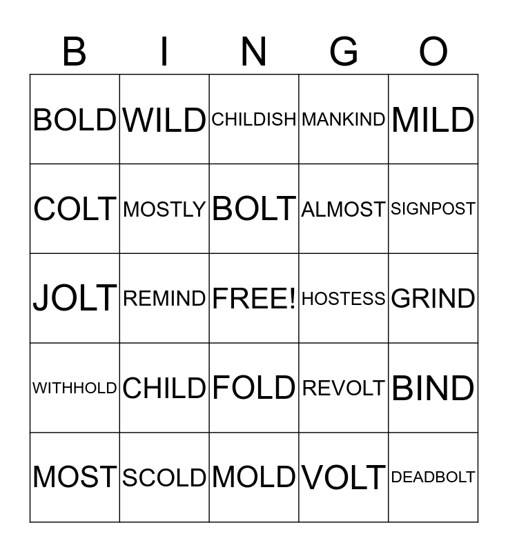 This bingo card has a free space and 24 words: CHILD, SCOLD, BOLT, MOST, MILD, BOLD, COLT, WILD, HOSTESS, FOLD, ALMOST, JOLT, REVOLT, BIND, MOSTLY, VOLT, GRIND, CHILDISH, SIGNPOST, REMIND, DEADBOLT, WITHHOLD, MANKIND and MOLD.