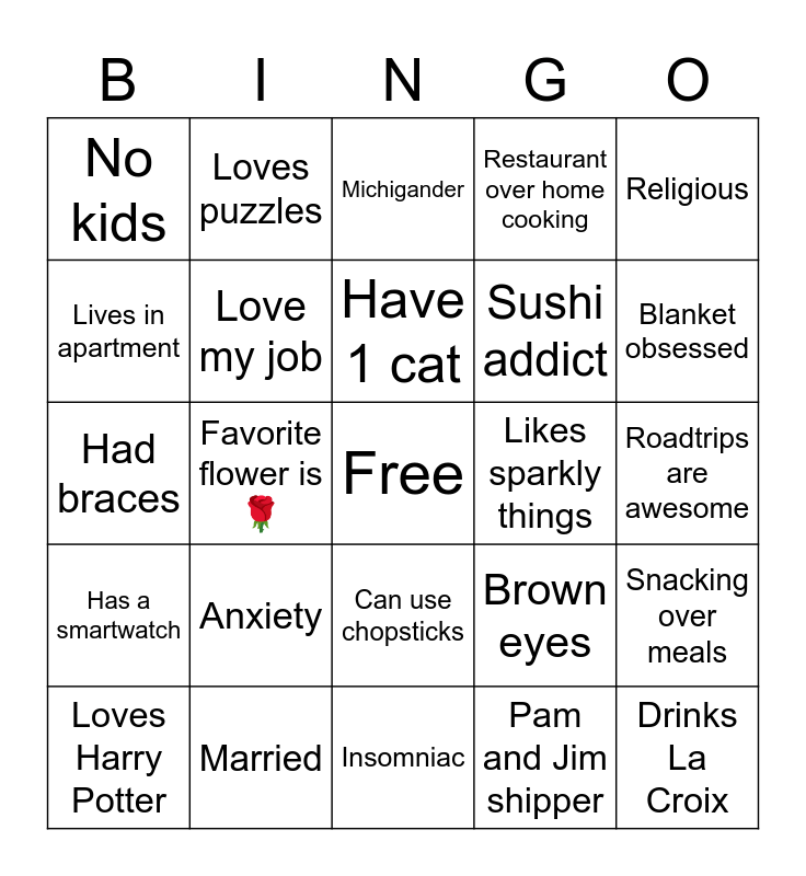 This bingo card has a free space and 24 words: Anxiety, Married, Have 1 cat, Loves Harry Potter, Religious, No kids, Lives in apartment, Loves puzzles, Likes sparkly things, Can use chopsticks, Sushi addict, Had braces, Brown eyes, Snacking over meals, Love my job, Pam and Jim shipper, Roadtrips are awesome, Michigander, Blanket obsessed, Favorite flower is 🌹, Drinks La Croix, Has a smartwatch, Restaurant over home cooking and Insomniac.