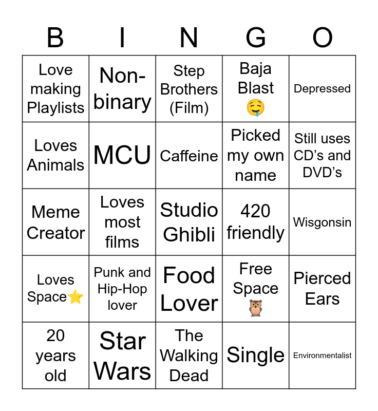 This bingo card has 25 words: Punk and Hip-Hop lover, The Walking Dead, Caffeine, 20 years old, Depressed, Love making Playlists, Loves Animals, Non-binary, 420 friendly, Food Lover, Picked my own name, Meme Creator, Free Space🦉, Pierced Ears, MCU, Environmentalist, Wisgonsin, Step Brothers (Film), Still uses CD’s and DVD’s, Loves most films, Studio Ghibli, Star Wars, Loves Space⭐️, Baja Blast 🤤 and Single.