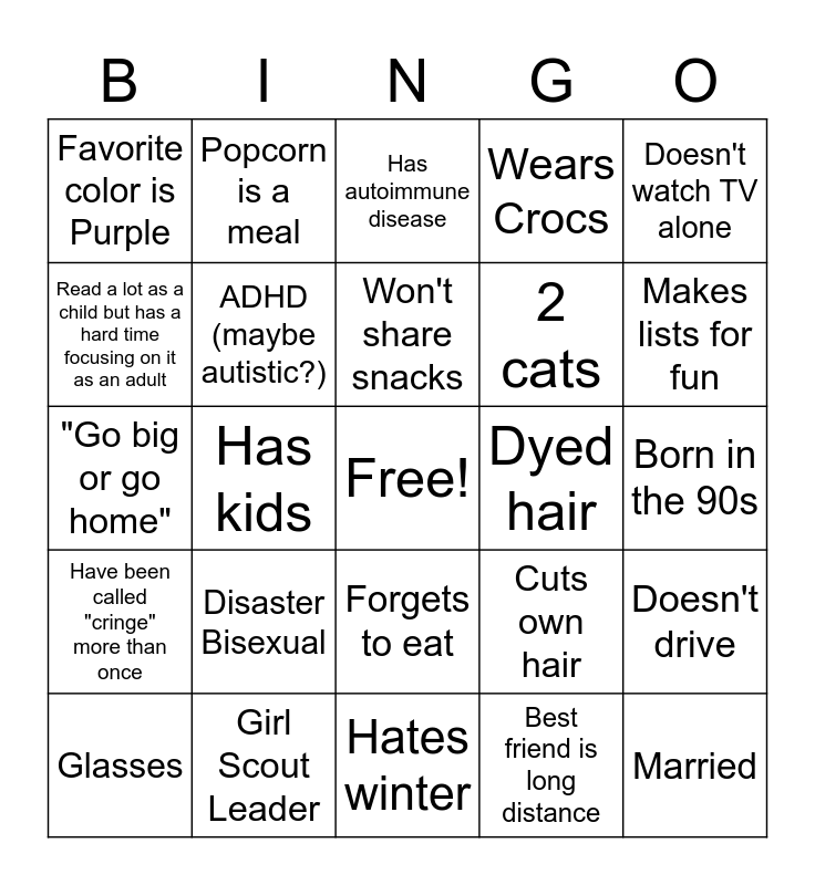This bingo card has a free space and 24 words: Disaster Bisexual, Girl Scout Leader, Won't share snacks, Glasses, Doesn't watch TV alone, Favorite color is Purple, Read a lot as a child but has a hard time focusing on it as an adult, Popcorn is a meal, Dyed hair, Forgets to eat, 2 cats, "Go big or go home", Cuts own hair, Doesn't drive, ADHD (maybe autistic?), Best friend is long distance, Born in the 90s, Has autoimmune disease, Makes lists for fun, Has kids, Married, Have been called "cringe" more than once, Wears Crocs and Hates winter.