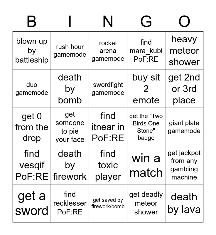 This bingo card has 25 words: death by firework, get saved by firework/bomb, swordfight gamemode, get a sword, heavy meteor shower, blown up by battleship, duo gamemode, rush hour gamemode, get the "Two Birds One Stone" badge, find toxic player, buy sit 2 emote, get 0 from the drop, win a match, get jackpot from any gambling machine, death by bomb, death by lava, giant plate gamemode, rocket arena gamemode, get 2nd or 3rd place, get someone to pie your face, find itnear in PoF:RE, find recklesser PoF:RE, find vesqif PoF:RE, find mara_kubi PoF:RE and get deadly meteor shower.