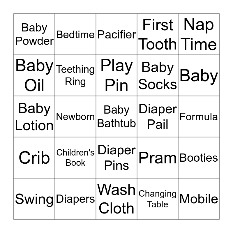 This bingo card has a free space and 24 words: Children's Book, Diapers, Play Pin, Swing, Nap Time, Baby Powder, Baby Oil, Bedtime, Diaper Pail, Diaper Pins, Baby Socks, Baby Lotion, Pram, Booties, Teething Ring, Changing Table, Formula, Pacifier, Baby, Newborn, Mobile, Crib, First Tooth and Wash Cloth.