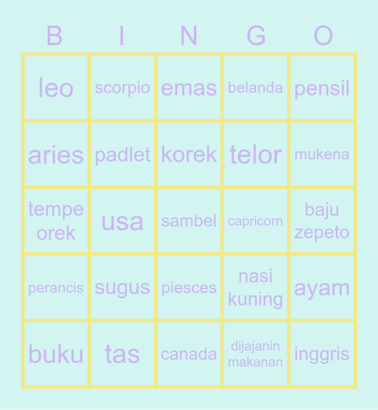 This bingo card has a free space and 24 words: sugus, tas, korek, buku, pensil, leo, aries, scorpio, capricorn, piesces, telor, tempe orek, nasi kuning, ayam, padlet, dijajanin makanan, baju zepeto, emas, mukena, usa, inggris, perancis, belanda and canada.