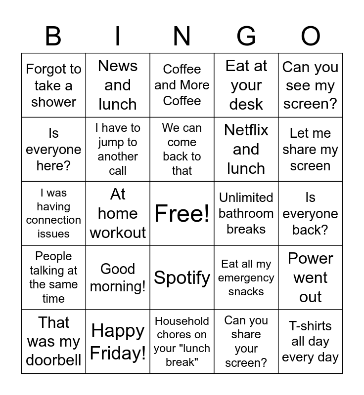 This bingo card has a free space and 57 words: Can you hear me?, That was my doorbell, Created a work playlist, Forgot to take a shower, Household chores on your "lunch break", Discovered a new snack, I have to jump to another call, Slept in late, Netflix and lunch, Help my kid with school work, Eat at your desk, Awkward silence, Technical difficulties, My hair is still wet, Sorry I was on mute, Can you scroll down?, Can you see my screen?, At home workout, Virtual happy hour, T-shirts all day every day, Unlimited bathroom breaks, I'll be right back, Eat all my emergency snacks, Coffee and More Coffee, You're on mute, We can come back to that, Changed zoom background, That's my dog barking, Let me share my screen, (Sound of someone typing), What's that noise?, (Coughing sound), Animal noises, Forgot what day it is, Is everyone back?, Is everyone here?, Waiting in the zoom lobby, I was having connection issues, Put pants on before dialing, People talking at the same time, News and lunch, Spotify, Missing my co-workers, I'm having connection issues, Driving/Traffic sounds, Late to work even if its work from home, Good morning!, Happy Friday!, Can you forward me that email?, Did we lose her?, How is everyone today?, Can you share your screen?, I was having connection issues, Wore same dress for more than 2 days, At home workout, Power went out and I have a delivery.
