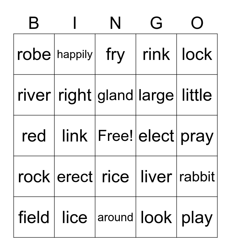 This bingo card has a free space and 41 words: led, red, light, right, lice, rice, gland, grand, lock, rock, link, rink, play, pray, elect, erect, lobe, robe, fly, fry, rabbit, raced, around, large, tree, crowd, look, ladder, little, lamb, ran, happily, field, threw, liver, river, wrinkled, old, loves, write and letters.