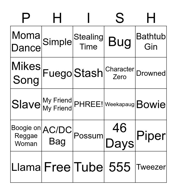 This bingo card has a free space and 24 words: AC/DC Bag, Free, Stash, Llama, Bathtub Gin, Moma Dance, Mikes Song, Simple, Weekapaug, Possum, Character Zero, Slave, 46 Days, Piper, Fuego, 555, Bowie, Stealing Time, Drowned, My Friend My Friend, Tweezer, Boogie on Reggae Woman, Bug and Tube.