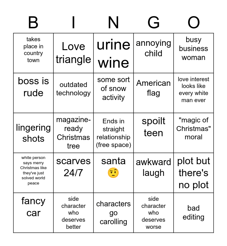 This bingo card has a free space and 39 words: Token diversity, Person who's whole personality is just Christmas, rich but acts middle class, outdated technology, fancy car, santa 🤨, some sort of snow activity, Christmas carol intro, busy business woman, white person says merry Christmas like they've just solved world peace, magazine-ready Christmas tree, annoying child, bad editing, "magic of Christmas" moral, spoilt teen, scarves 24/7, lead female has the most fake voice, takes place in country town, hot chocolate, awkward laugh, boss is rude, characters go carolling, American flag, love interest looks like every white man ever, one too many cheers, "I dONt LiKe ChRiStMaS", Person is annoyed by caring parents, Over protective dad, Love interest is already married/taken, Love triangle, Sensual baking/cooking, Big family dinner, urine wine, side character who deserves better, side character who deserves worse, next level shitty joke, plot but there's no plot, lingering shots and dumb montage.