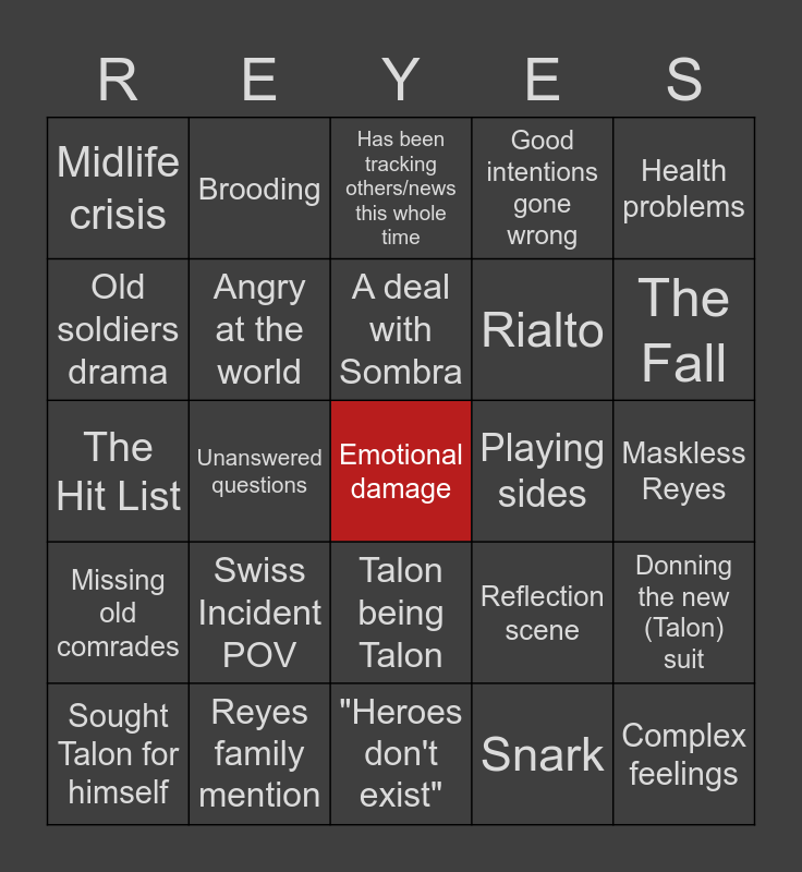 This bingo card has a free space and 24 words: Swiss Incident POV, Reyes family mention, A deal with Sombra, Sought Talon for himself, Health problems, Midlife crisis, Old soldiers drama, Brooding, Playing sides, Talon being Talon, Rialto, The Hit List, Reflection scene, Donning the new (Talon) suit, Angry at the world, Snark, Maskless Reyes, Has been tracking others/news this whole time, The Fall, Unanswered questions, Complex feelings, Missing old comrades, Good intentions gone wrong and "Heroes don't exist".