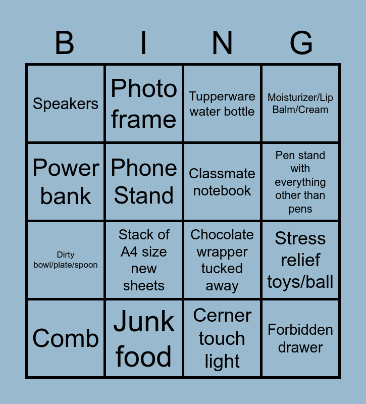 This bingo card has 16 words: Comb, Junk food, Tupperware water bottle, Moisturizer/Lip Balm/Cream, Power bank, Photo frame, Chocolate wrapper tucked away, Stress relief toys/ball, Speakers, Phone Stand, Cerner touch light, Pen stand with everything other than pens, Dirty bowl/plate/spoon, Stack of A4 size new sheets, Classmate notebook and Forbidden drawer.