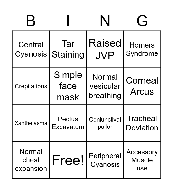 This bingo card has 21 words: Free!, Wheeze, Tar Staining, Clubbing, Peripheral Cyanosis, Normal vesicular breathing, Central Cyanosis, Raised JVP, Conjunctival pallor, Corneal Arcus, Xanthelasma, Horners Syndrome, Accessory Muscle use, Non re-breathe mask, Simple face mask, Nasal Cannulae, Normal chest expansion, Pectus Excavatum, Crepitations, Tracheal Deviation and Reduced breath sounds..