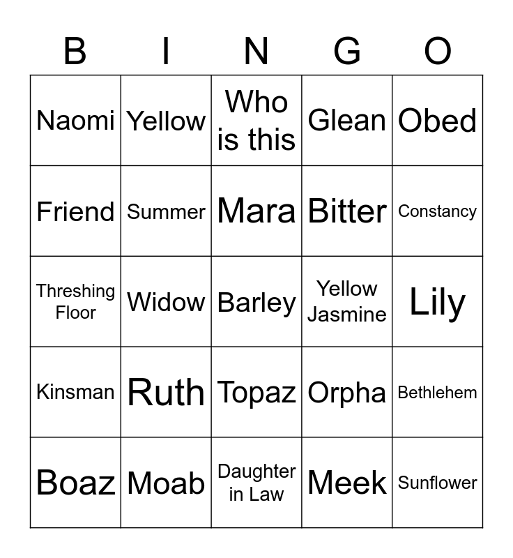 This bingo card has a free space and 24 words: Ruth, Moab, Mara, Boaz, Obed, Naomi, Friend, Yellow, Yellow Jasmine, Topaz, Bitter, Threshing Floor, Orpha, Bethlehem, Summer, Meek, Lily, Who is this, Constancy, Widow, Sunflower, Kinsman, Glean and Daughter in Law.