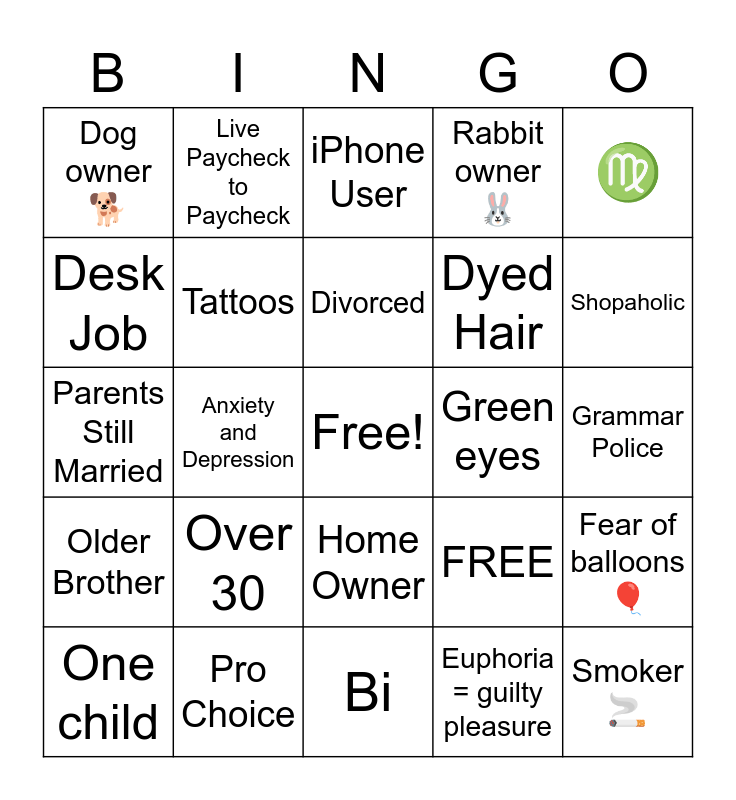 This bingo card has a free space and 25 words: Over 30, Bi, Divorced, One child, ♍️, Dog owner 🐕, Desk Job, Live Paycheck to Paycheck, Green eyes, Home Owner, Dyed Hair, Parents Still Married, FREE, Fear of balloons 🎈, Tattoos, Body Piercings, Grammar Police, iPhone User, Shopaholic, Anxiety and Depression, Smoker 🚬, Pro Choice, Older Brother, Rabbit owner 🐰 and Euphoria = guilty pleasure.