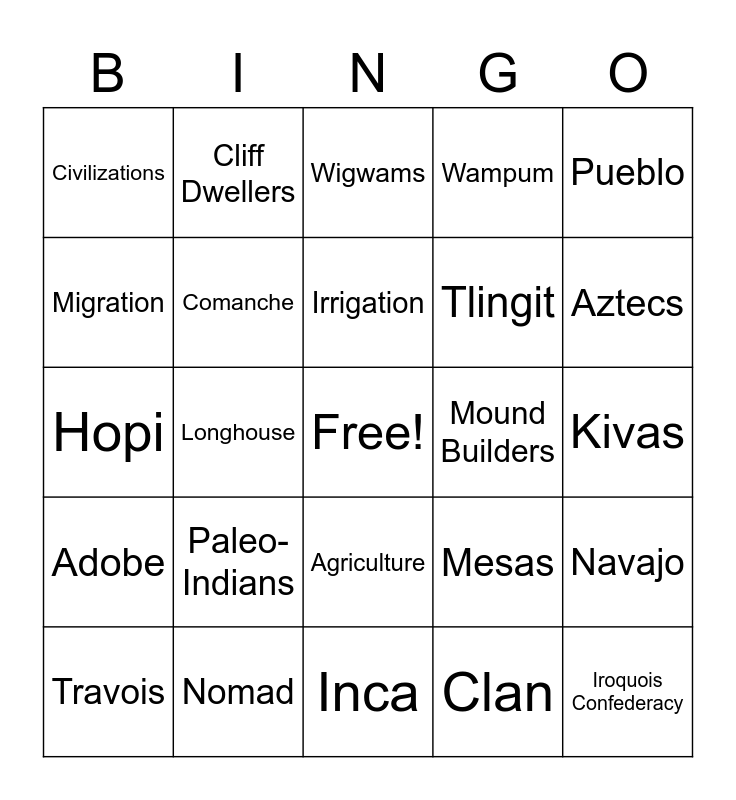 This bingo card has a free space and 26 words: Agriculture, Clan, Irrigation, Nomad, Pueblo, Civilizations, Migration, Cliff Dwellers, Kivas, Mesas, Tlingit, Hopi, Navajo, Travois, Longhouse, Confederation, Wampum, Adobe, Wigwams, Iroquois Confederacy, Aztecs, Inca, Mound Builders, Paleo-Indians, Comanche and pawnee.