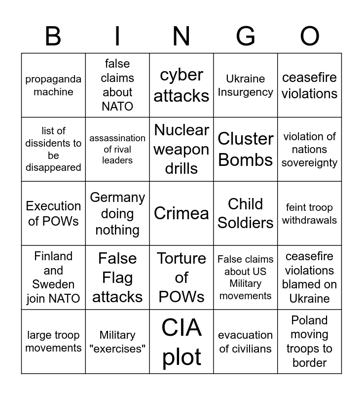 This bingo card has a free space and 24 words: False Flag attacks, Military "exercises", Nuclear weapon drills, large troop movements, ceasefire violations, propaganda machine, list of dissidents to be disappeared, false claims about NATO, Child Soldiers, Torture of POWs, Cluster Bombs, Execution of POWs, False claims about US Military movements, ceasefire violations blamed on Ukraine, assassination of rival leaders, evacuation of civilians, feint troop withdrawals, cyber attacks, violation of nations sovereignty, Germany doing nothing, Poland moving troops to border, Finland and Sweden join NATO, Ukraine Insurgency and CIA plot.