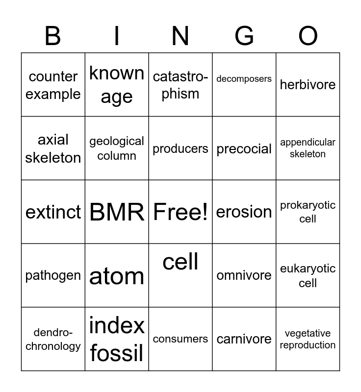 This bingo card has a free space and 24 words: atom, index fossil, producers, dendro-chronology, herbivore, counter example, axial skeleton, known age, erosion, cell, precocial, extinct, omnivore, eukaryotic cell, geological column, carnivore, prokaryotic cell, catastro- phism, appendicular skeleton, BMR, vegetative reproduction, pathogen, decomposers and consumers.